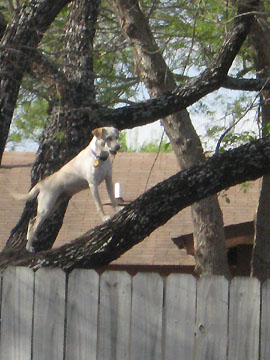 | Curious dog barking at the walkers. Does your dog climb trees? |